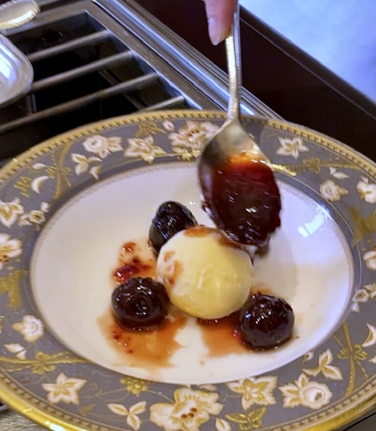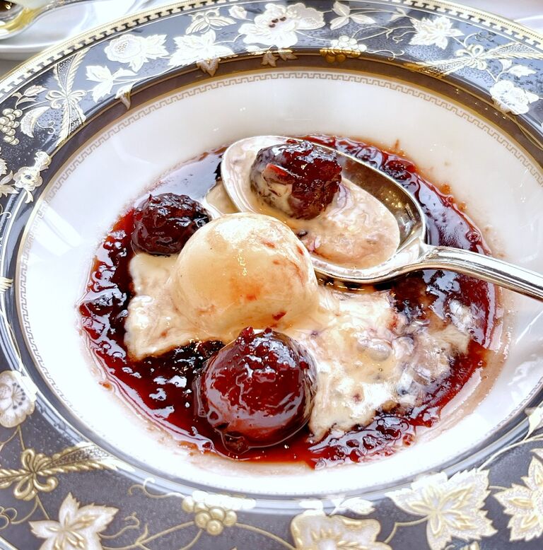 チェリーソースをアイスクリームにかけて完成。