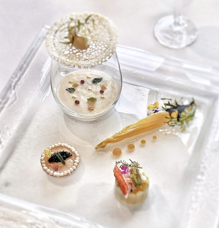 続いて、フォアグラを使った桃のスープや蟹のサラダなど、オードブルは4種盛り合わせ。