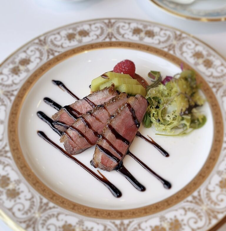 スフレパンケーキを添えた鴨肉のロティ。
