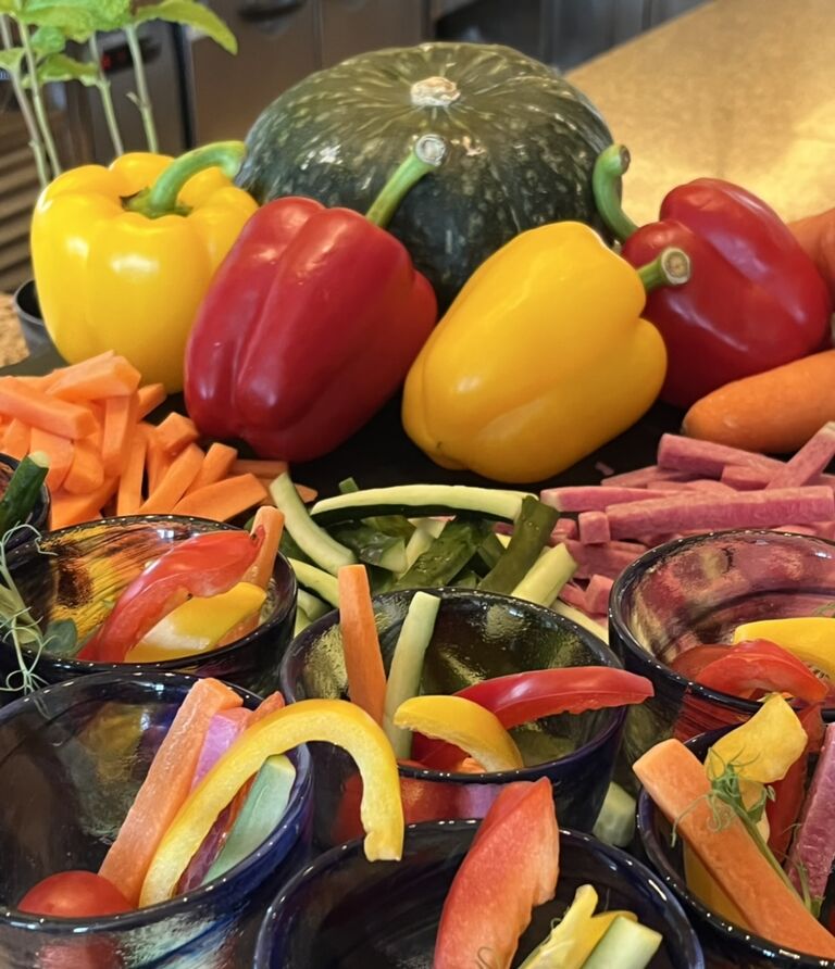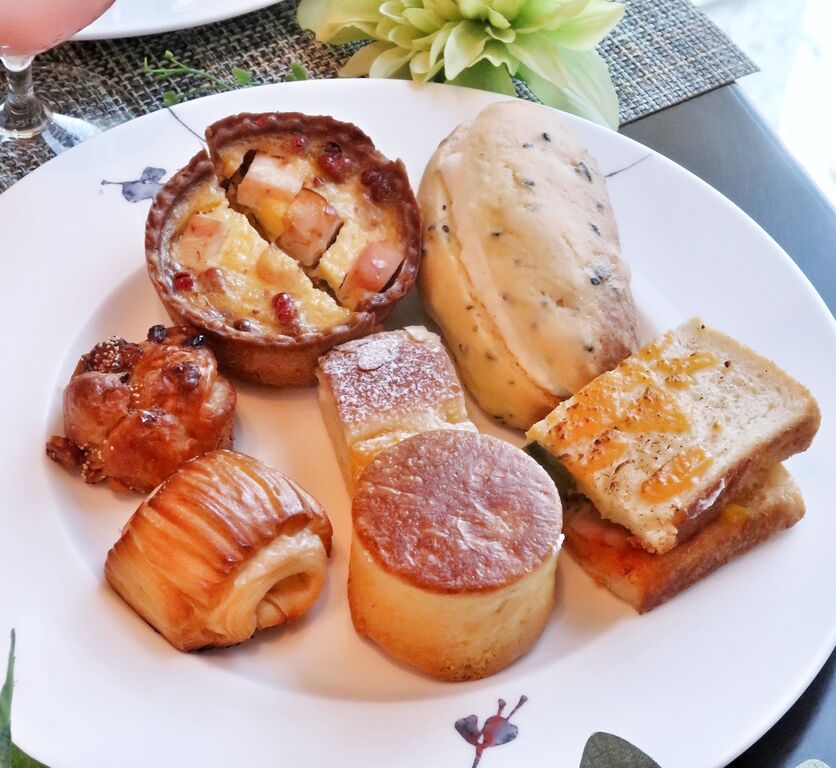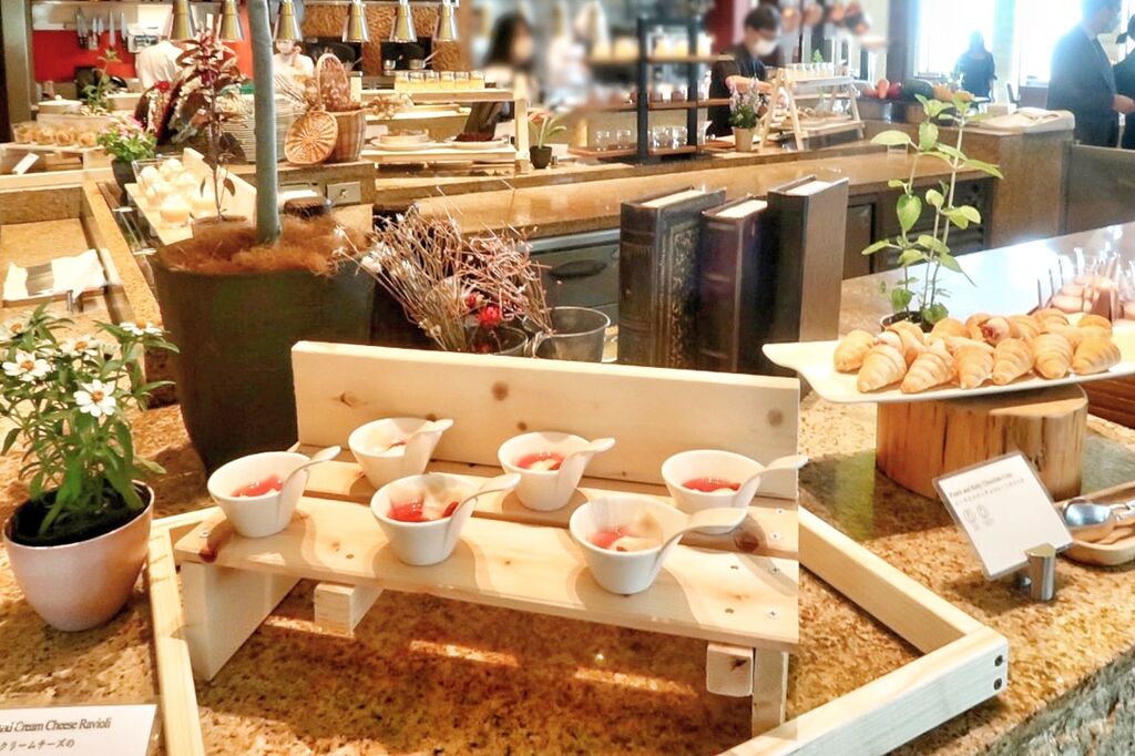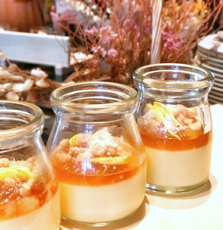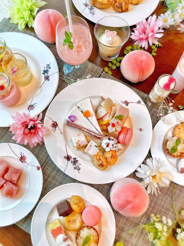桃のスイーツにお花やハーブが添えてあり、ブッフェ台は庭園のようでかわいかった〜🥰🥰