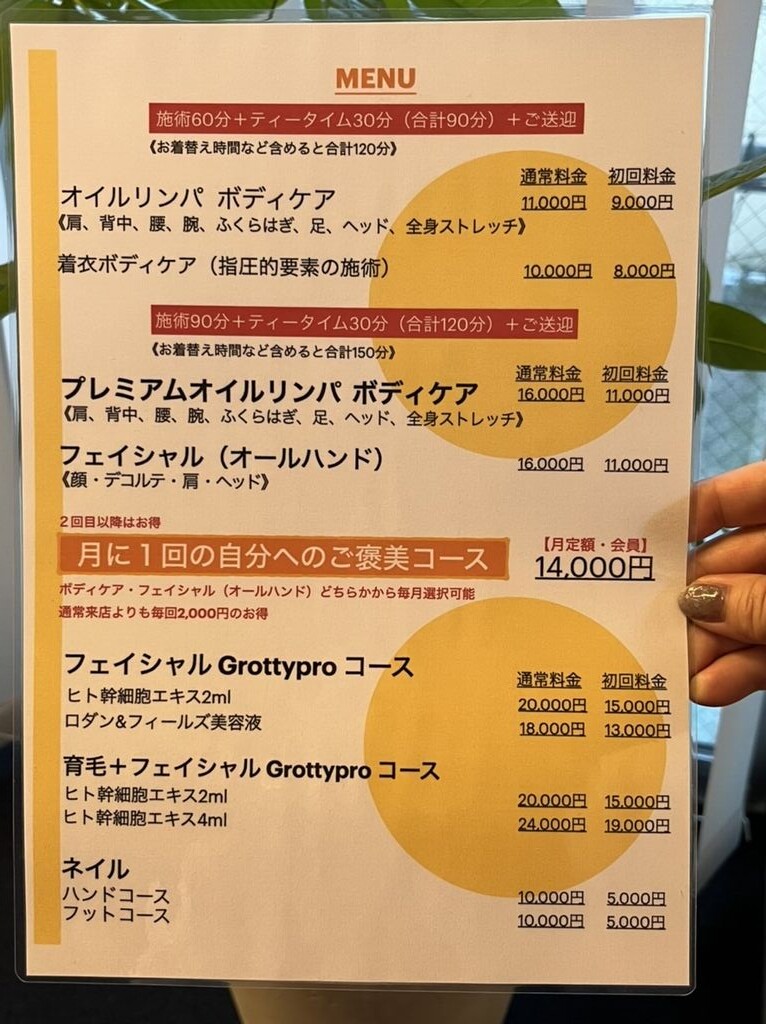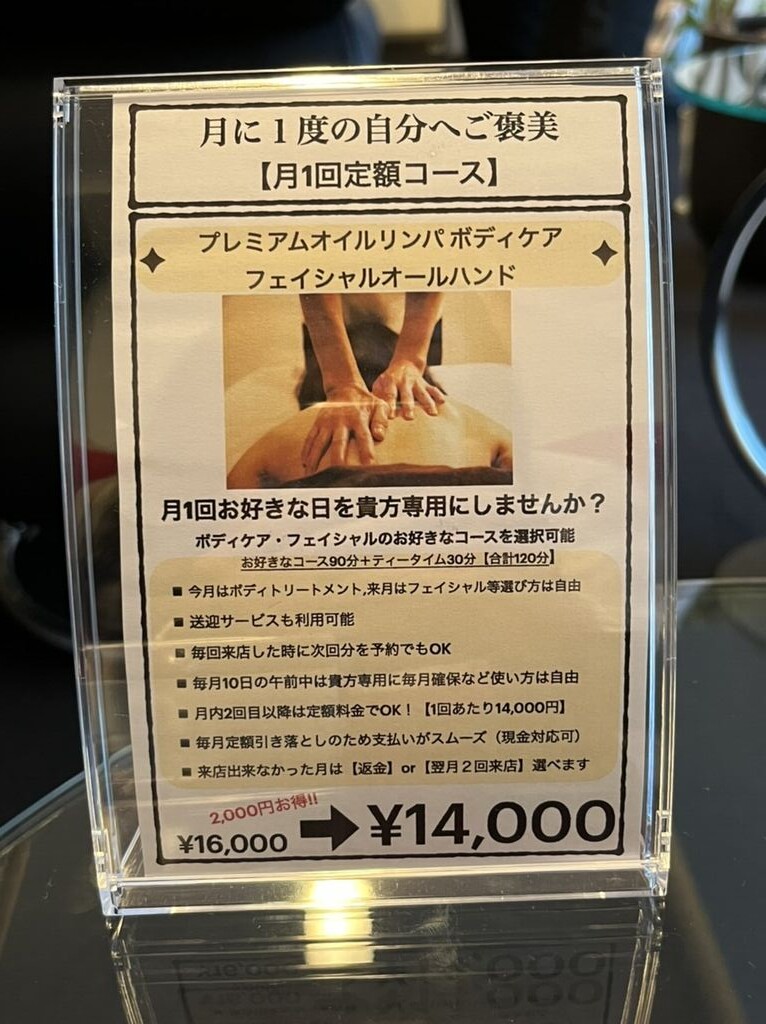 私が受けたのは「プレミアムオイルリンパ ボディケア」というもので、通常料金16000円。(初回は11000円)