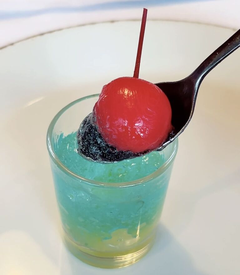 乾杯は、グアバジュースとブルーキュラソーのツートンカクテル。
