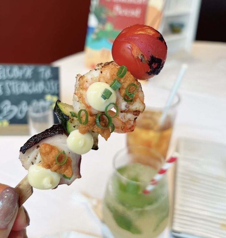 シーフードの串焼きは、備長炭の炭火焼きなので香りと火の通り方が絶妙。