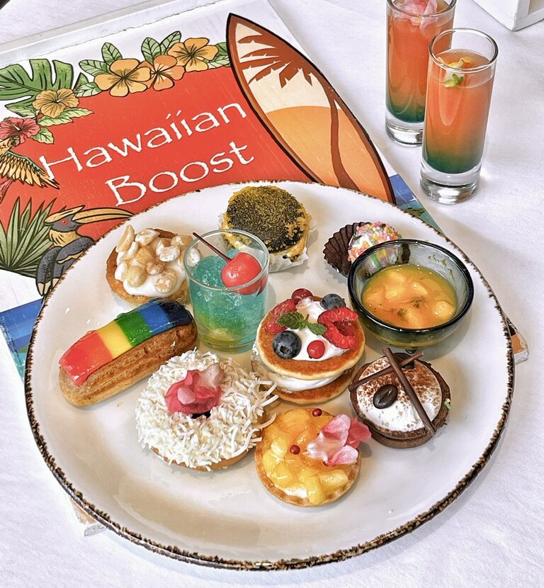 ココナッツドーナツ、アサイーとバナナのボンボンショコラ、パイナップルハウピアクリームパイ、コナコーヒーのチョコレートケーキ、レインボーエクレア、マンゴーサラダ、マンゴーウーピーパイ、バナナマカダミアナッツケーキ、ミニパンケーキ、ブルーハワイ風オレンジゼリー。