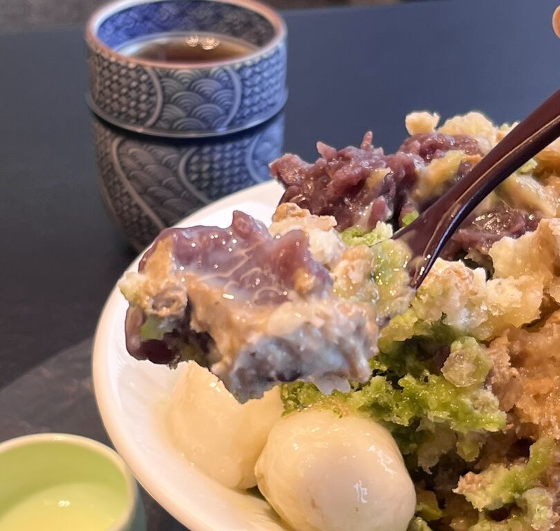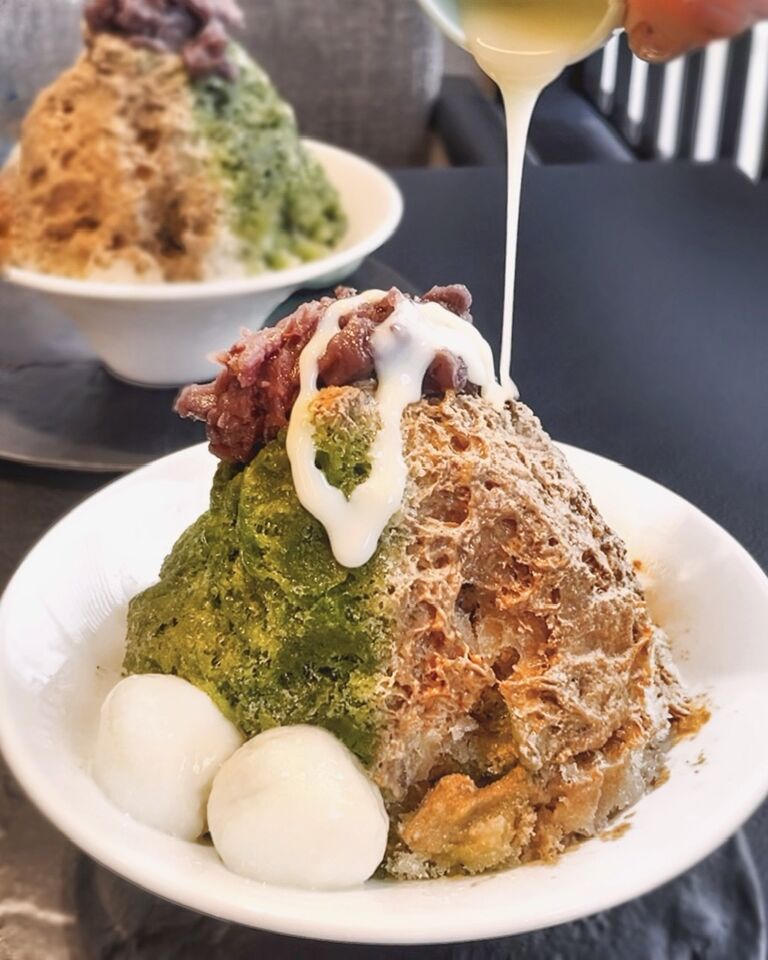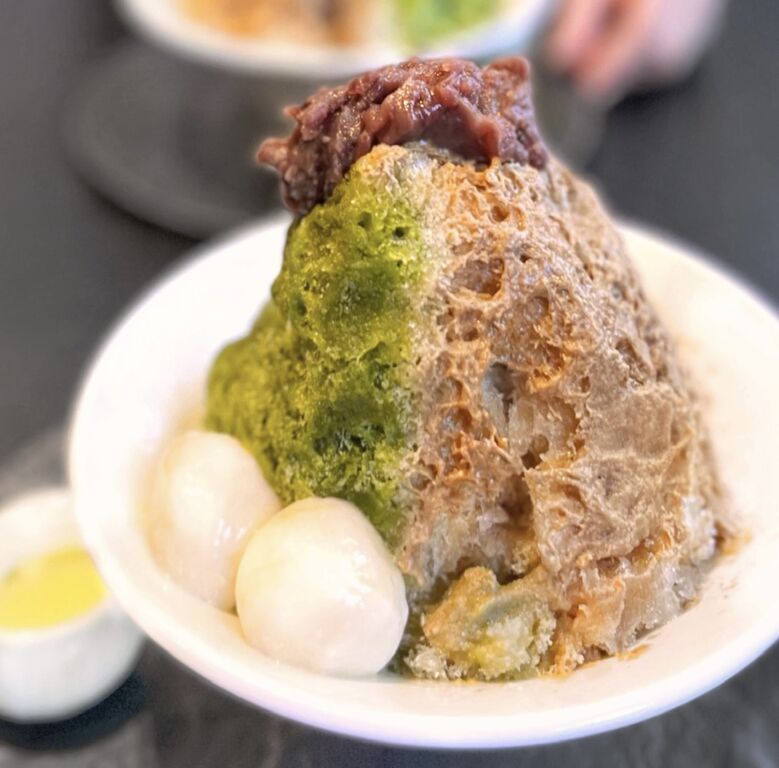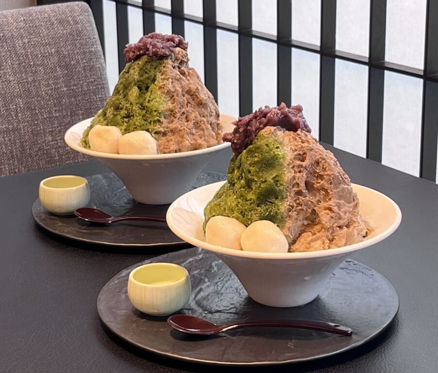 京都宇治の丸九小山園の抹茶とほうじ茶の自家製ソースを、贅沢に2種類味わえるかき氷です✨✨