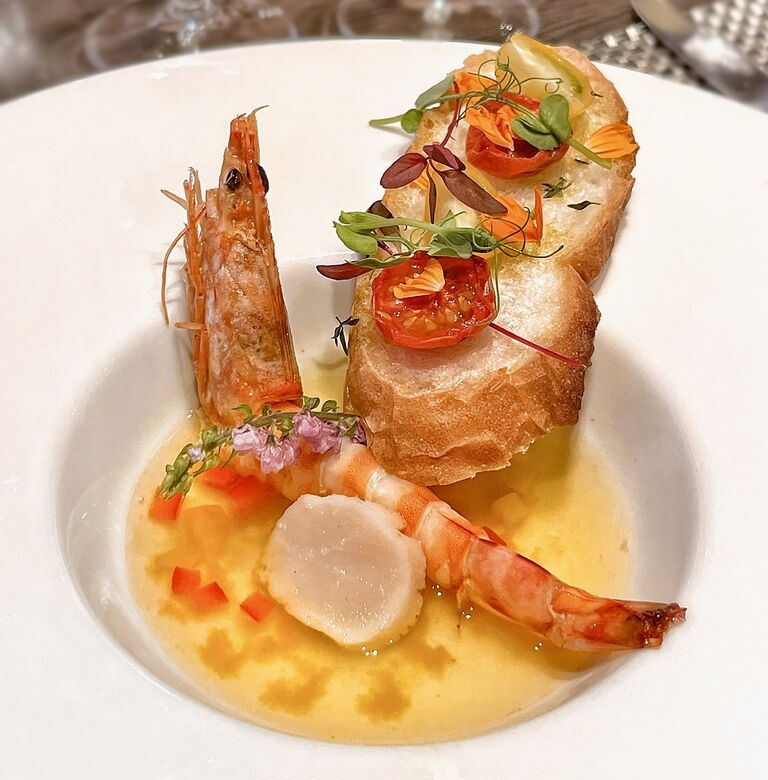 ぷりぷりの海老。サフラン風味のスープにレア感残る帆立。