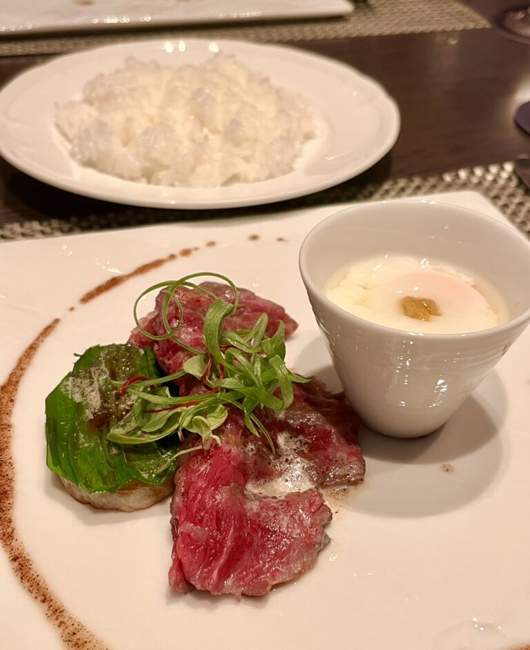 国産牛ロース肉のポッシェ ~SUKIYAKI~ブールノアゼットと温度卵京の黄真珠を使った柚子胡椒のアクセント