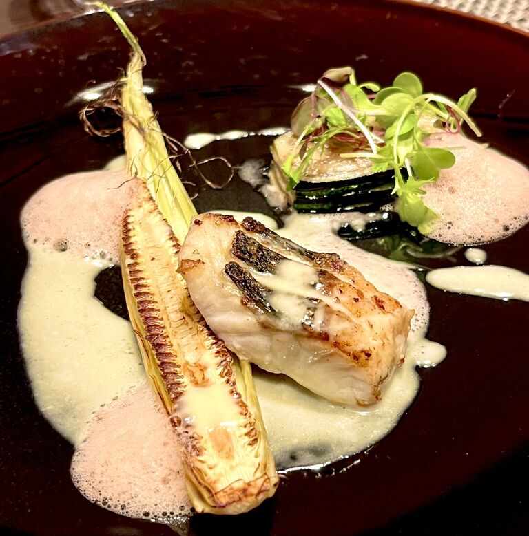 バターソースと、ベルノー(濁り酒)が香るとまとのエキューム(泡)とともに。