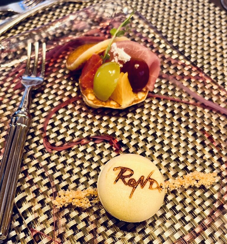 <アミューズ>生ハムとフルーツのブリニRONDE MONAKA ~サーモンと西利のお漬物~