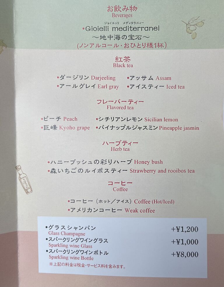 「Gioielli mediterranei(ジョイエッリ メディタラニィー)~地中海の宝石~」と名付けられた美しいモクテルつき。