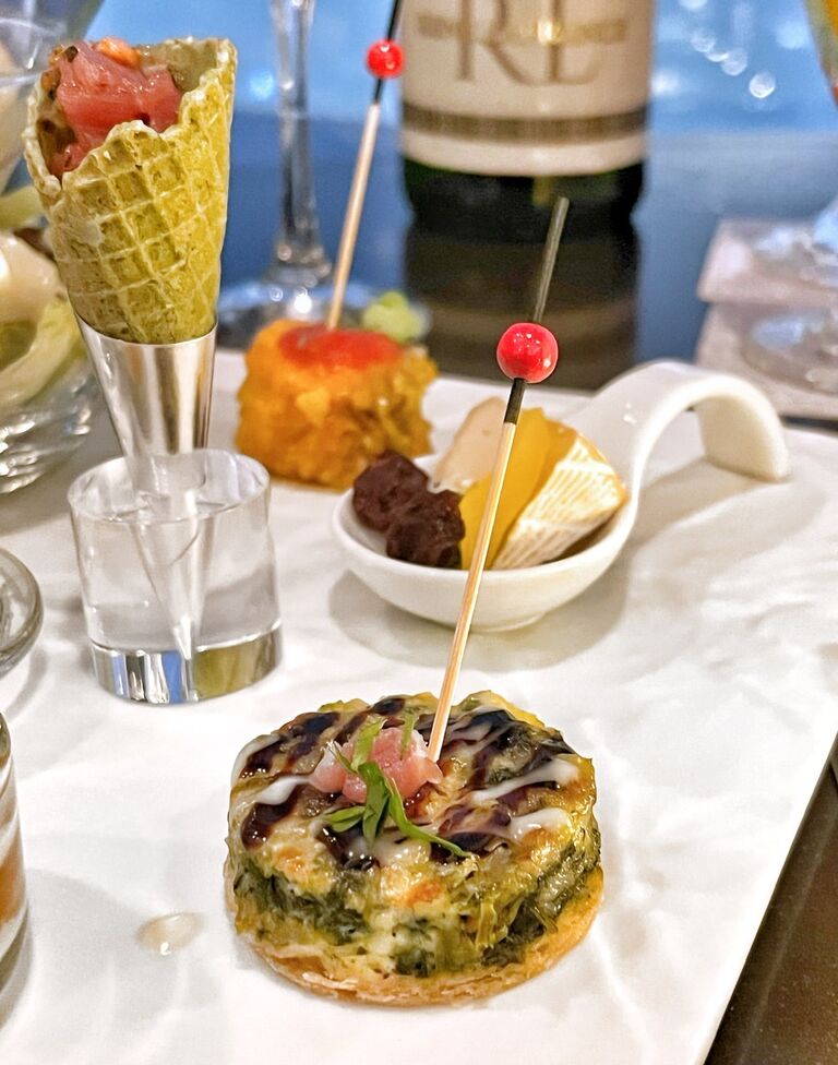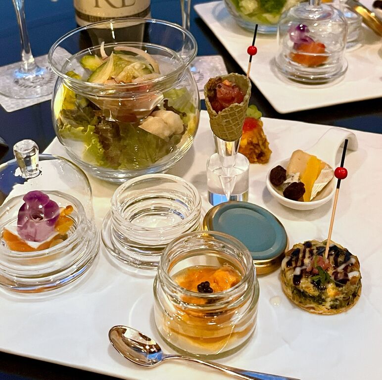 ウニ、キャビア添えのカリフラワーのフォンダンなど、豪華食材を使用し、美しく盛りつけられた“オードブル7種の盛り合わせ”。