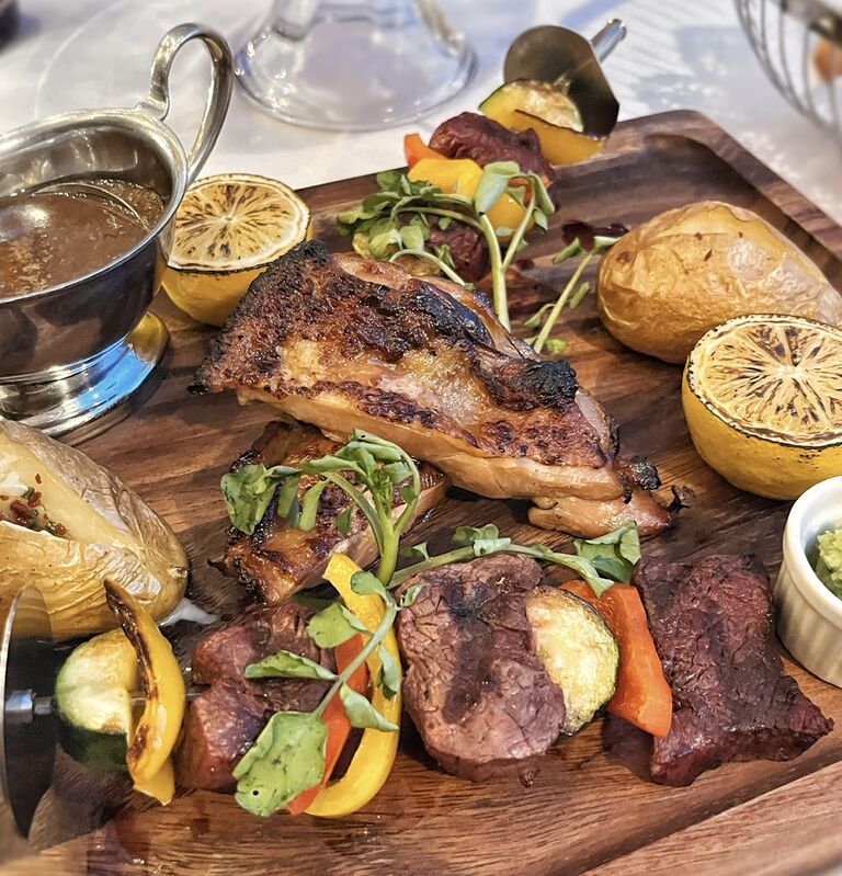 赤身の牛肉は柔らかく、チキンには下味つき。ごろッと皮付きのジャガイモなど、ボリュームたっぷり。
