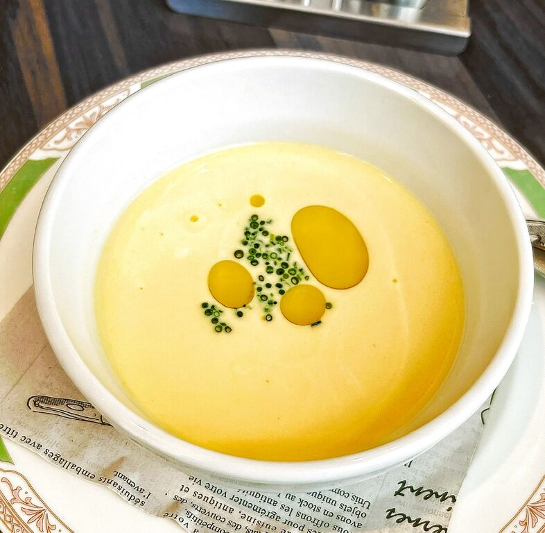 本日のスープは、「とうもろこしの冷製スープ」。