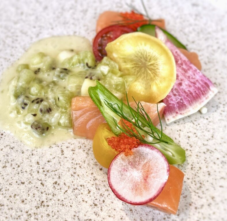 オードブルは、「サーモンマリネと夏野菜のサラダ 菜園風 キウイフルーツのラヴィゴットソース」。