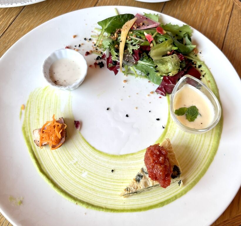 サラダ(ドレッシング別添え)、キッシュ、ちっちゃな合鴨スモーク、桃のスープ。