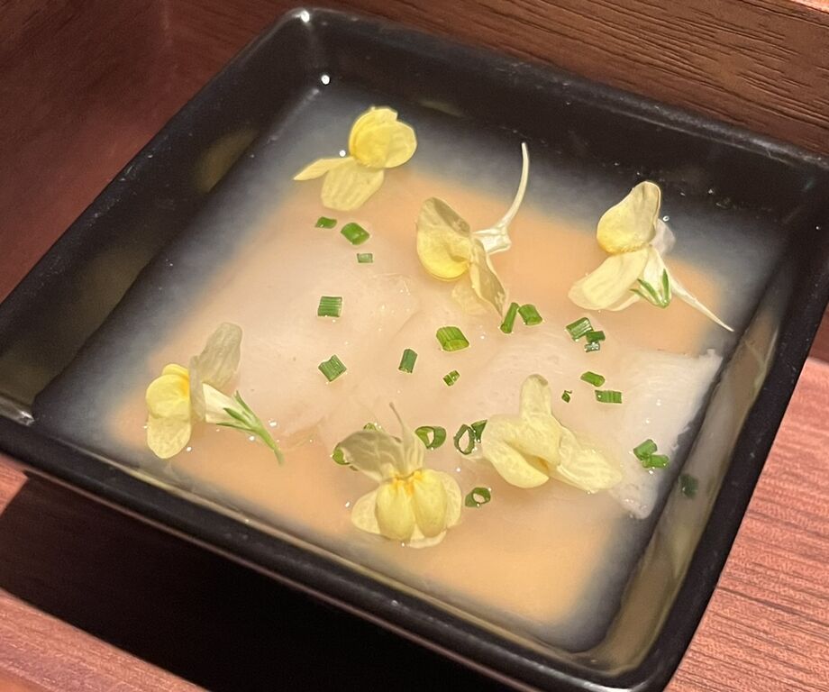 ・冷製アワビのフラン エディブルフラワーと貝のジュレ