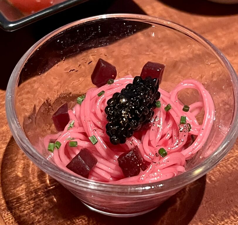 ピンクのパスタにブラックベリーとビーツがキラキラで乙女な一品。
