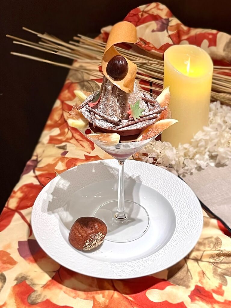 なんて美しい♡「châtaigne chérie(シャテーニュ シェリー)」とはフランス語で“最愛の栗”という意味だそうです。モンブランの上には渋皮栗とシガレットクッキーをのせて高さがあります。小枝や紅葉、たっぷりのいちじくが飾られ、秋一色。