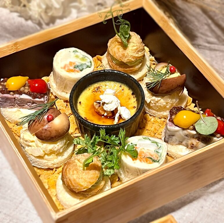 甘く焦がしたポップコーンののったコーンプリンが中央に配され、パテドカンパーニュなどをのせたカナッペ4種が2つずつ入っています。