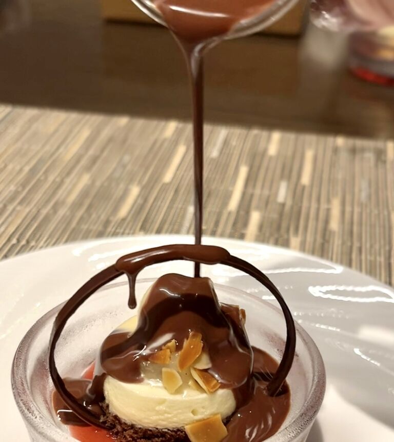 食べる直前に、温かいチョコレートソースをかけると、冷たいバニラアイスクリームが溶け、ラズベリーソースも相まって、ああ、この”冷やあつ”マリアージュにうっとり♡