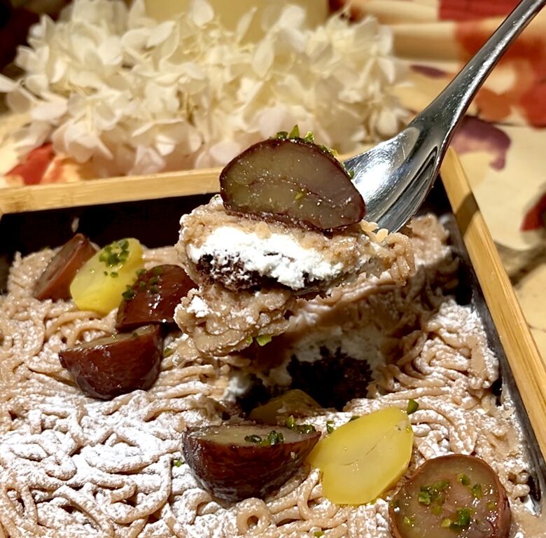 ほんのりラム酒の香るチョコレートスポンジと生クリームの上に、たっぷりのマロンクリーム。甘露煮と渋皮煮の栗がころころとのっています。