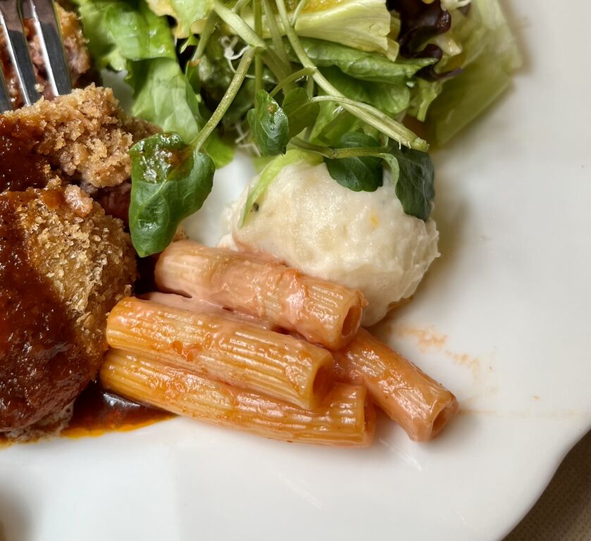 付け合わせはケチャップマカロニとマッシュポテト、サラダ。