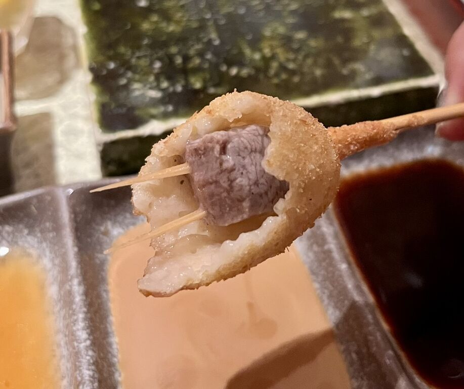 衣は、細かなパン粉をまとったふっくらとした厚みのある生地で、たっぷりとソースをつけて味える大阪串カツタイプ。
