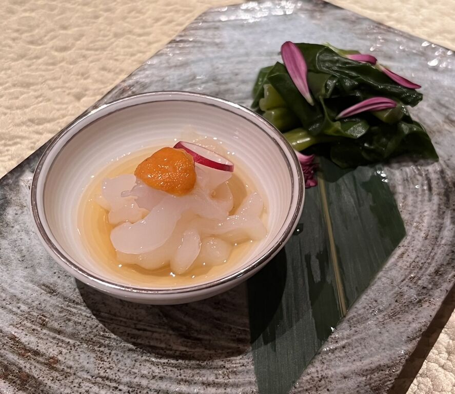前菜2種は、イカそうめんとつるむらさきのおひたし。