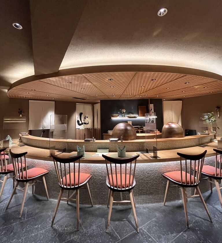 網代天井(あじろてんじょう)、木製のカウンター、温かみと高級感のある空間で良い感じ♡