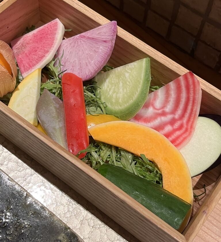 お野菜は木箱に、パプリカ、色付きの大根各種、ナス、カボチャ、ホオズキ、珍しい食用サボテン、グラパラリーフなどがきれいに並べられ、