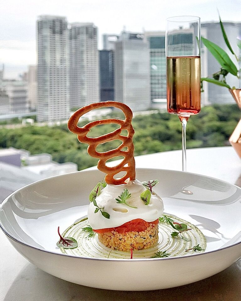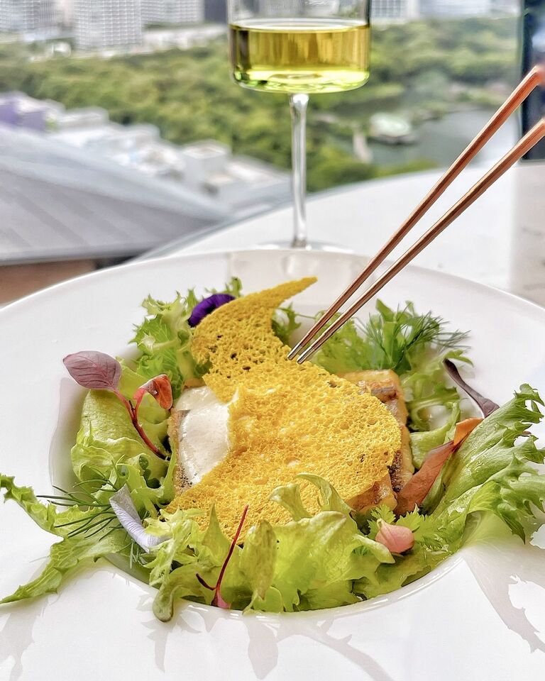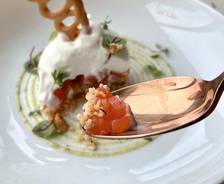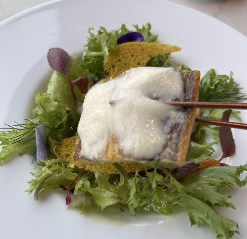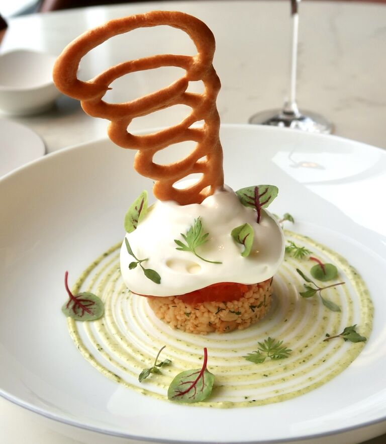 サクサクのシュー生地の竜巻模様がささった、千葉の肉厚のトラウトサーモン、ぶどう、クスクスなどをふわふわのエスプーマで包んだ一皿。