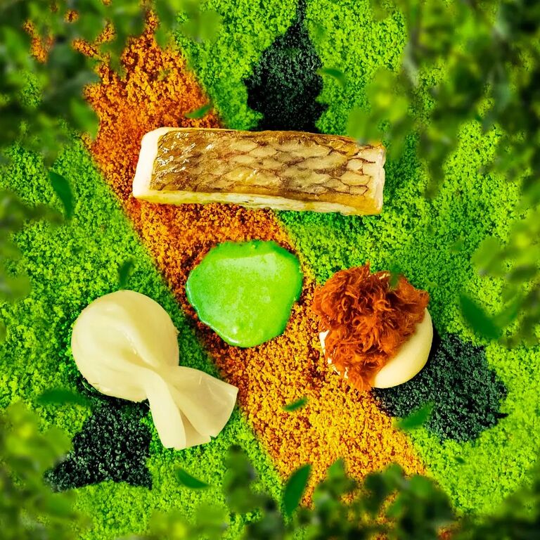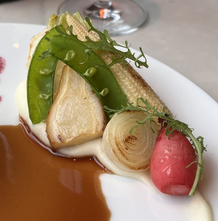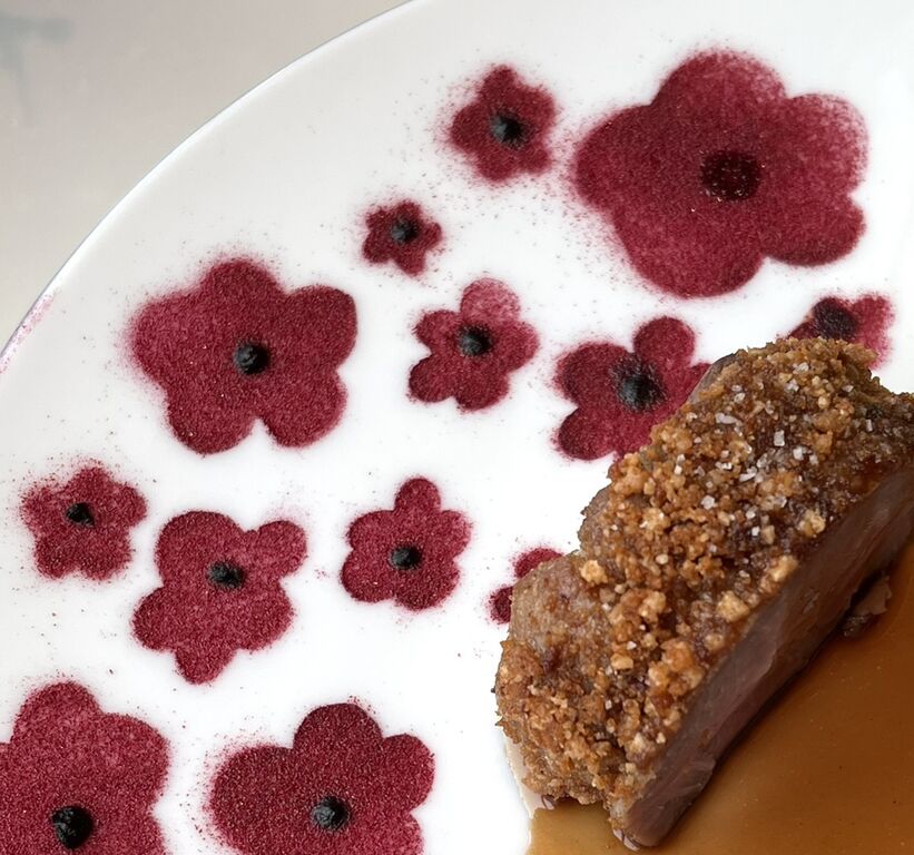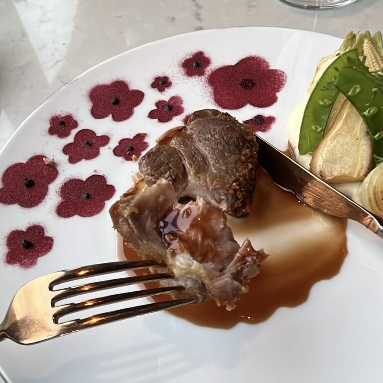 ケシのお花は真っ赤なビーツのパウダーと黒にんにくのピューレで毒々しく描かれています。(食べようとしましたが、しっかりお皿にくっついていました)