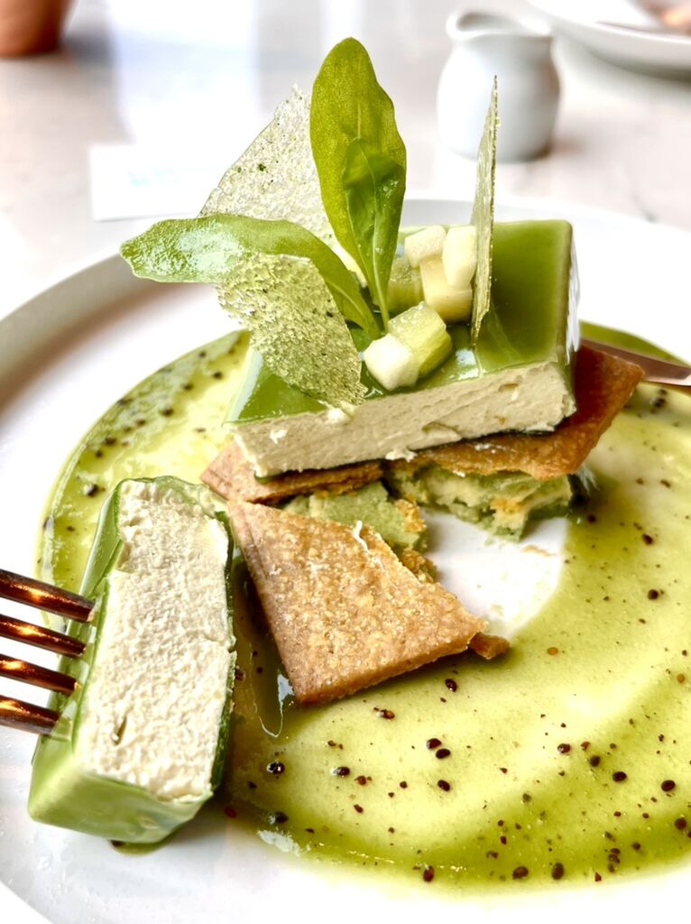 青りんご、ピスタチオ、ハーブ、キウイなどの緑色の食材をうまくとり合わせて、甘みや酸味、食感も楽しめるトレンドカラーのグリーンの素敵なデザートでした♪