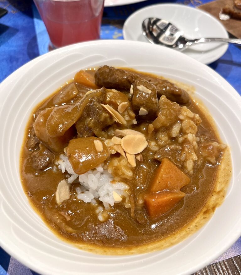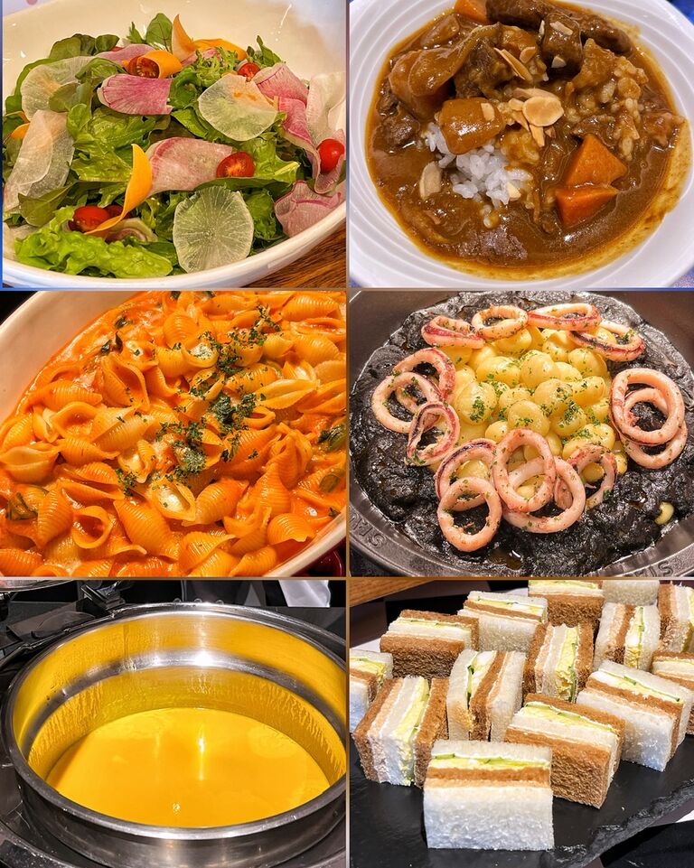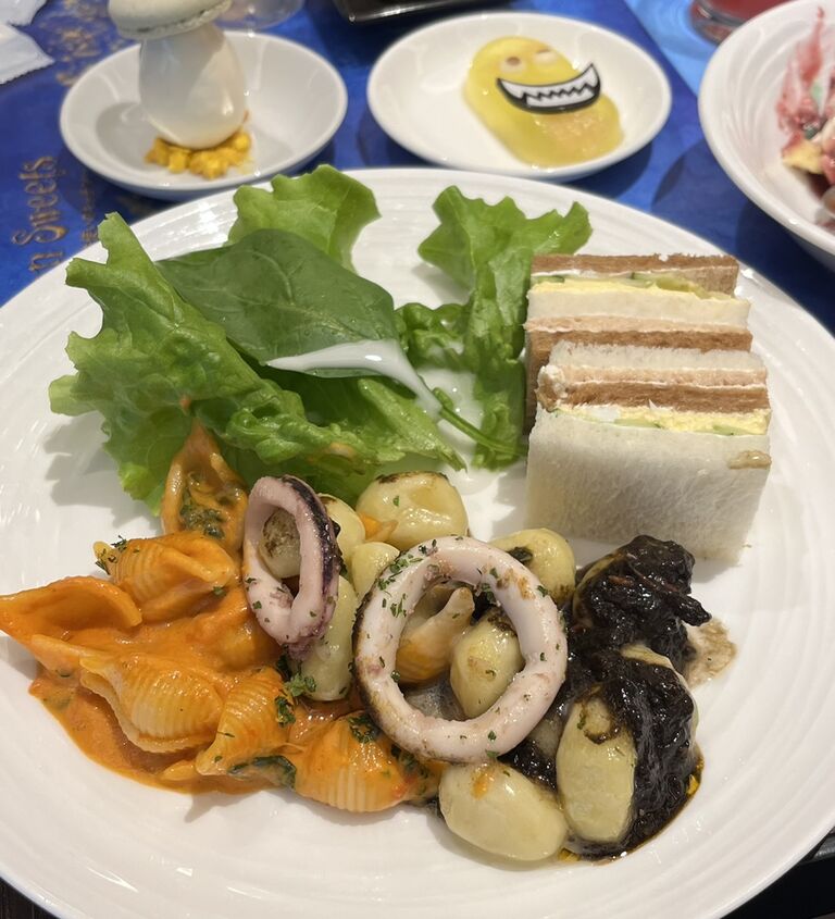 セイボリーは、イカ墨のニョッキ、海老のクリームパスタ、牛肉がゴロゴロのビーフカレーなど。