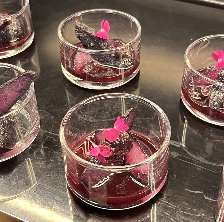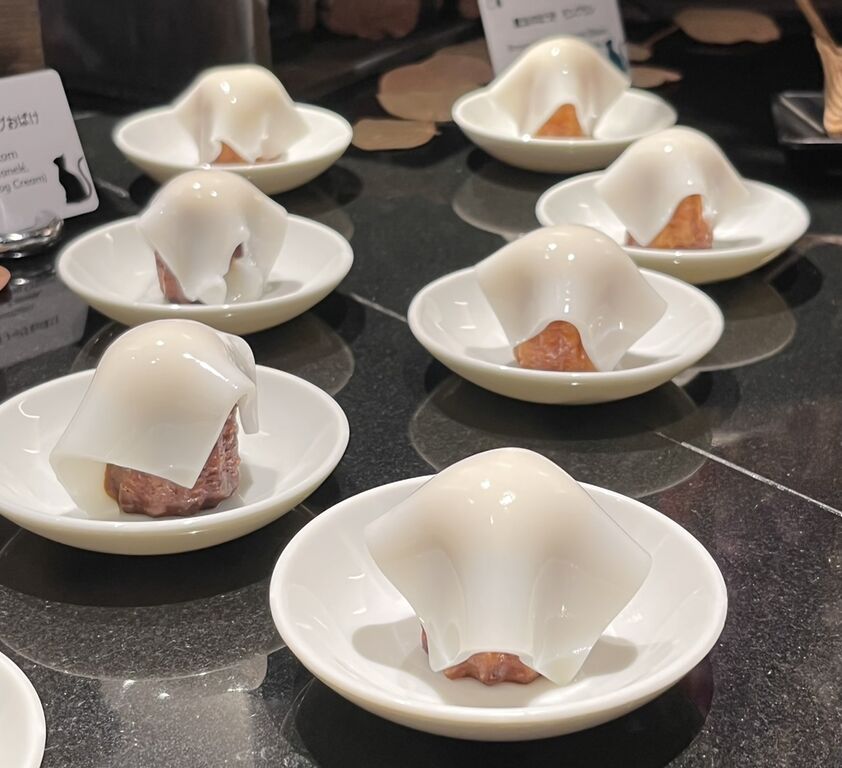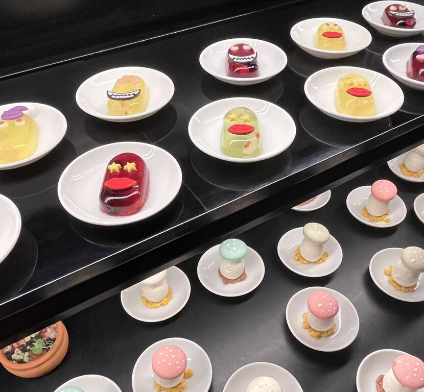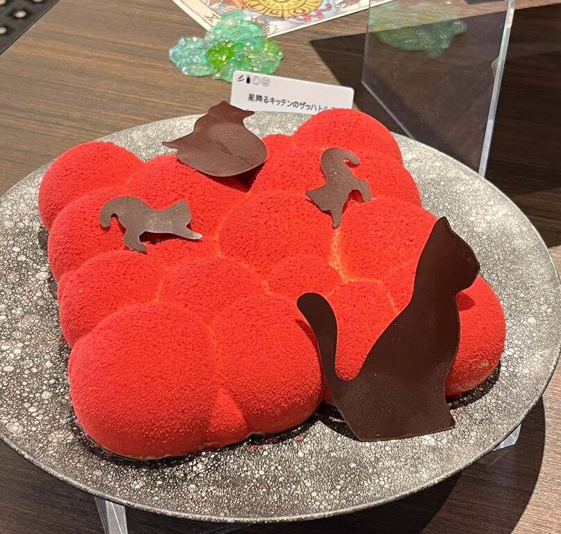 赤いふかふかのクッションに黒猫が遊ぶ「黒猫と真っ赤なクッション ピスタチオとアプリコットゼリー」は、アーモンドババロアがベースでピスタチオが味わえました。