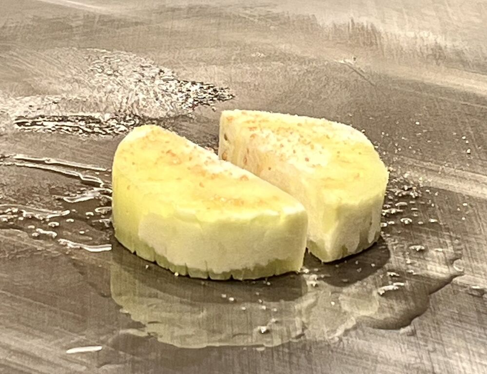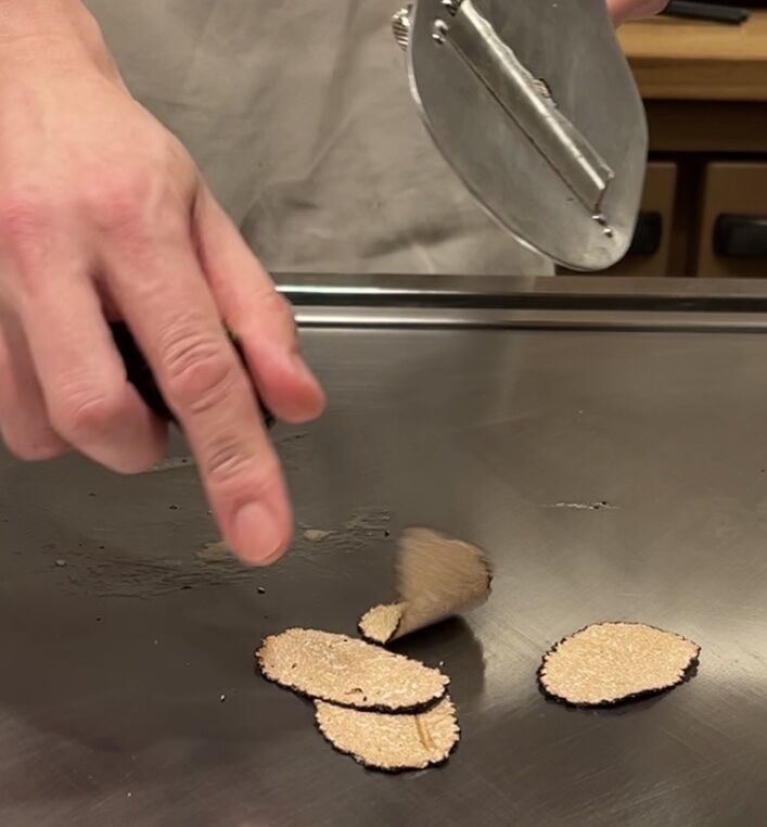 トリュフは鉄板の上で削って少し温め?半分の大きさにカット。