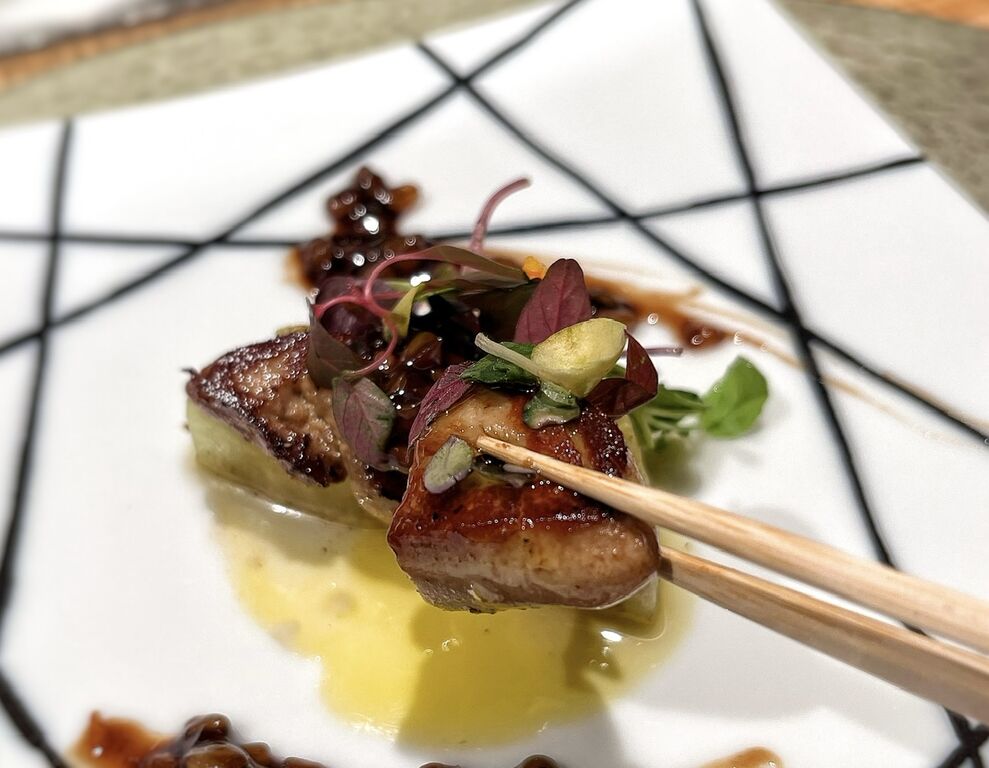秋のなすとフォアグラを焼き、金山味噌とバルサミコを合わせたコンディメント添え。