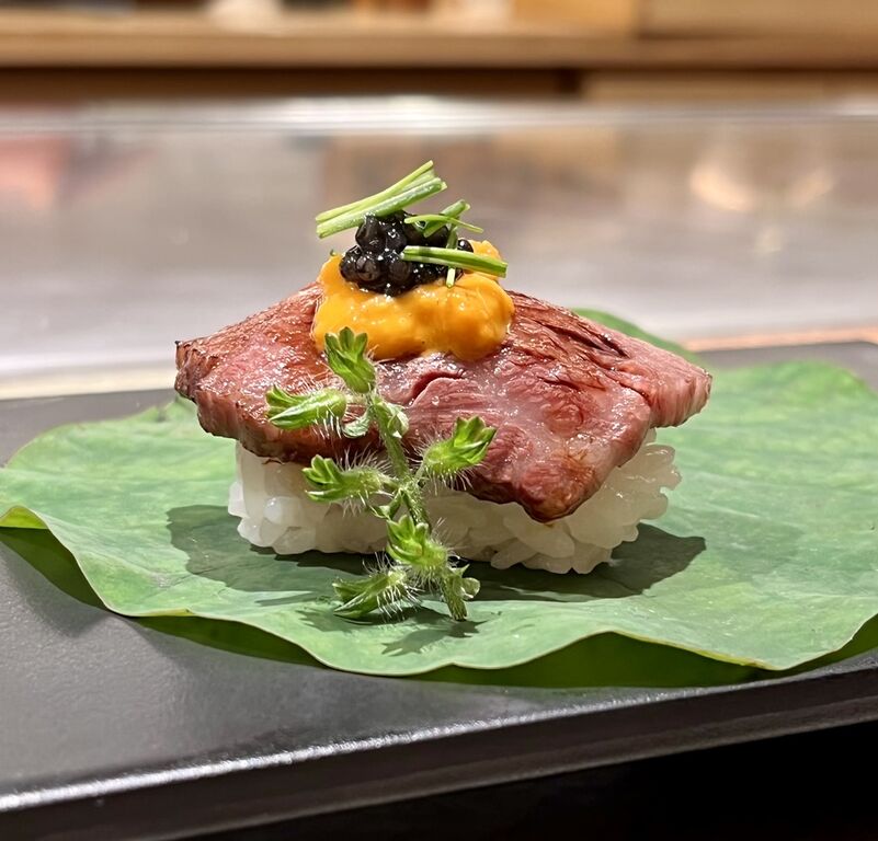 ・黒毛和牛リブロースかぶり 生雲丹とキャビアの炙り肉寿司