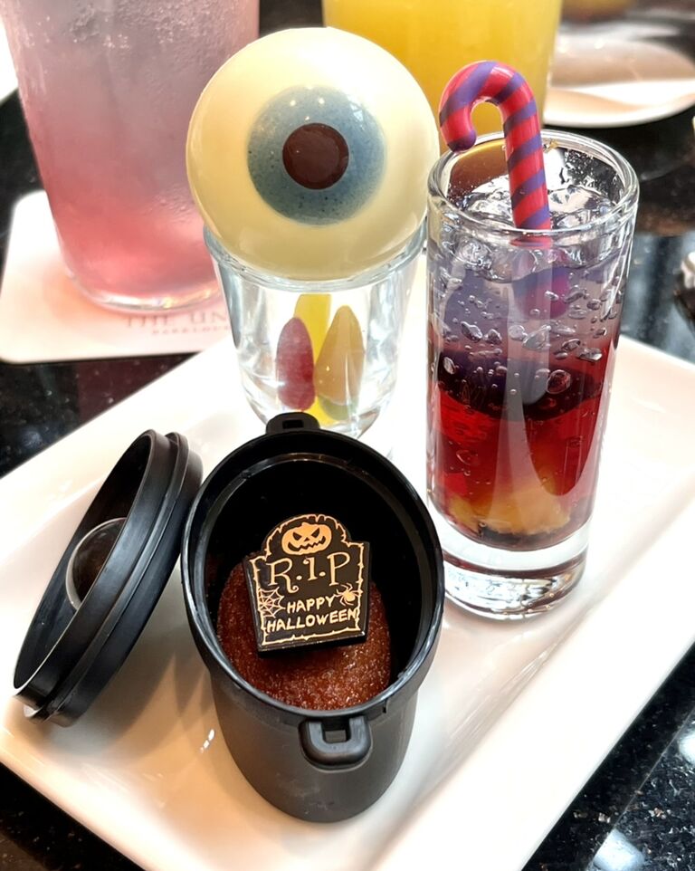 季節のカクテル&モクテルから、まあるい氷の入ったブルーのカクテル「マジックナイト」とチェリーシロップを注いで仕上げるモクテル「チェリーオレンジソーダ」をいただきました。