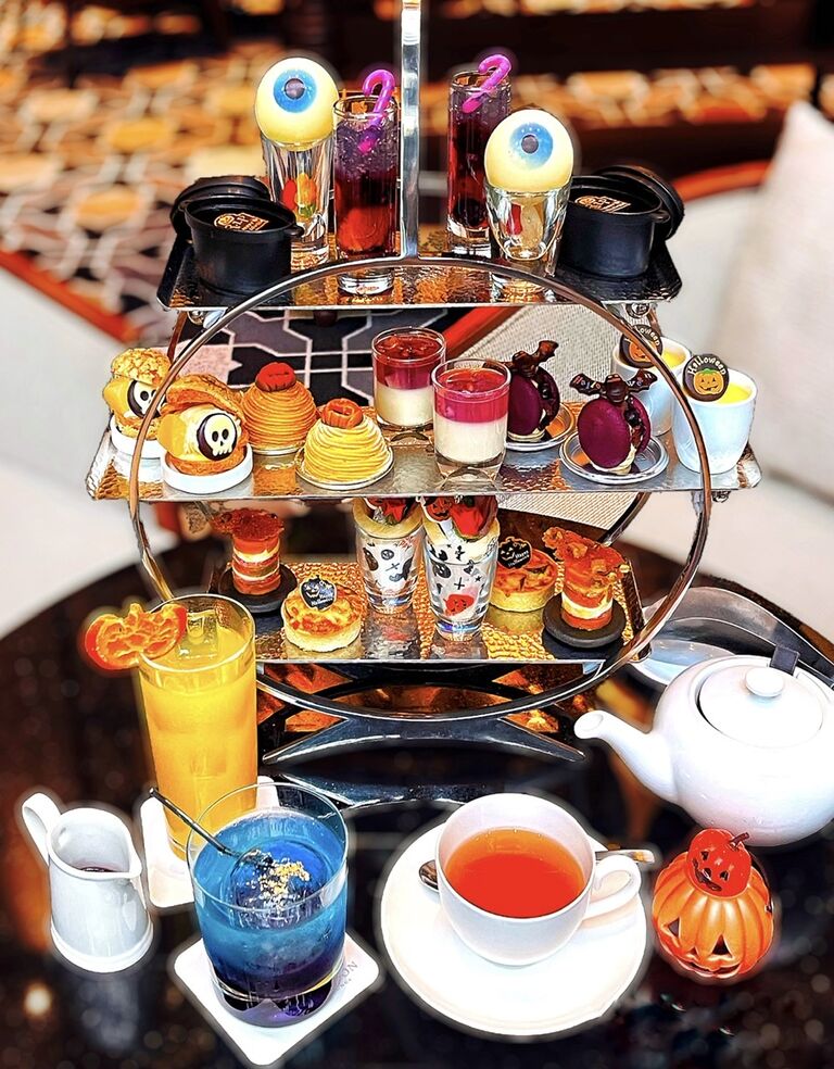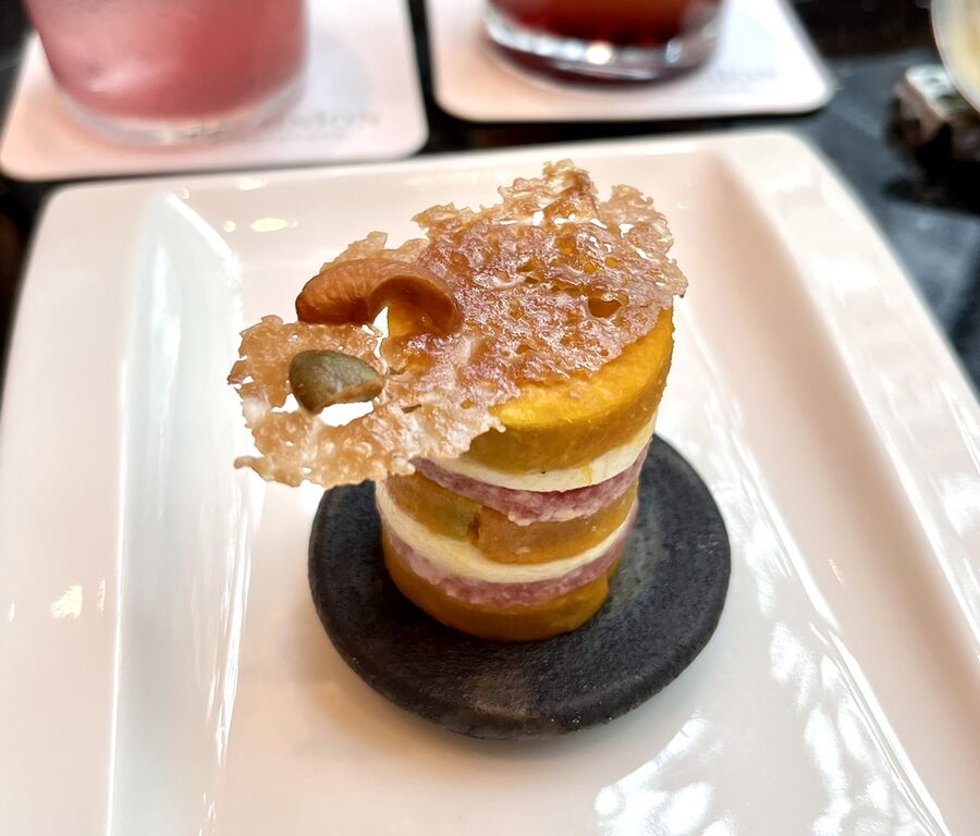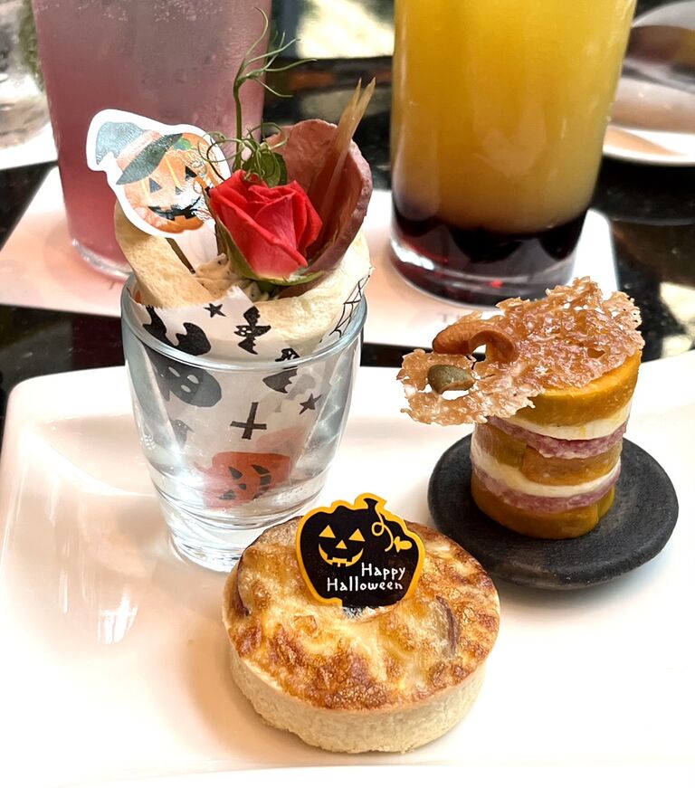 ローストパンプキンとカマンベールチーズ、生サラミがミルフィーユ仕様。羽根飾りのついたシルクハットに見えます!