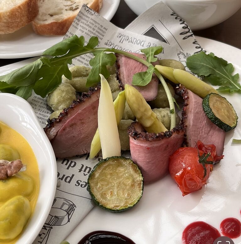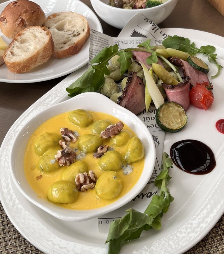 今週のパスタは「南瓜のニョッキ ゴルゴンゾーラの香り、自家製 鴨パストラミと共に」。