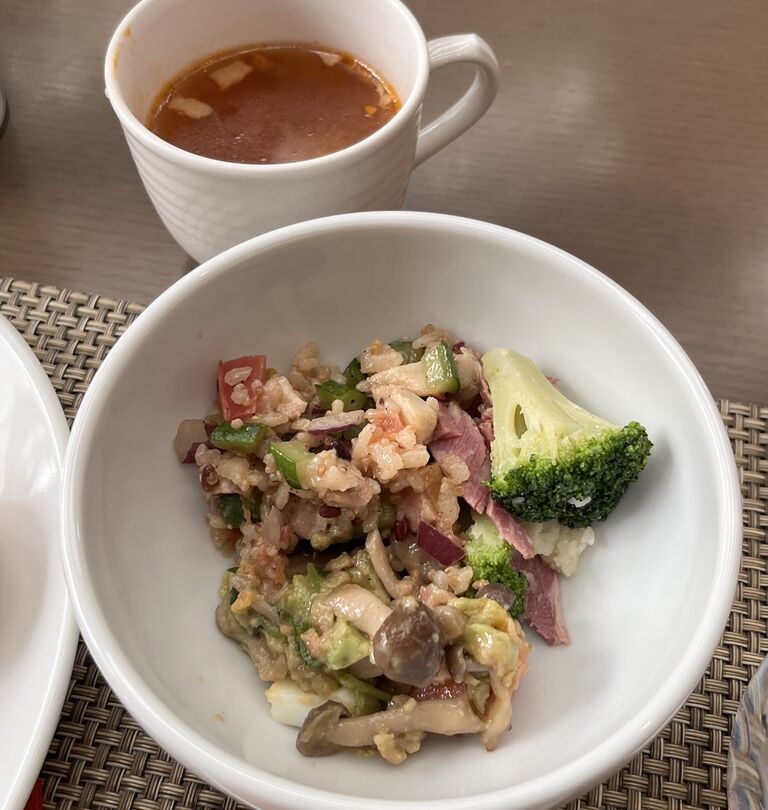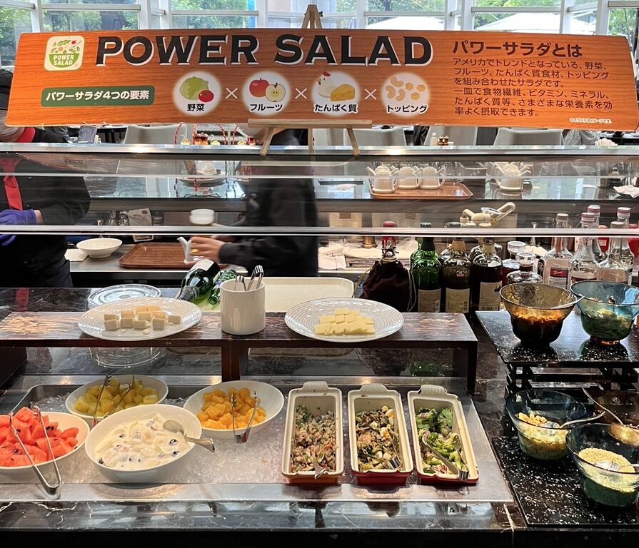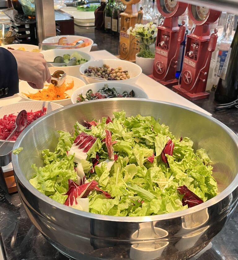 サラダバーとスープバーがついていて、生野菜はもちろんのこと、デリなど、サラダの種類が豊富。
