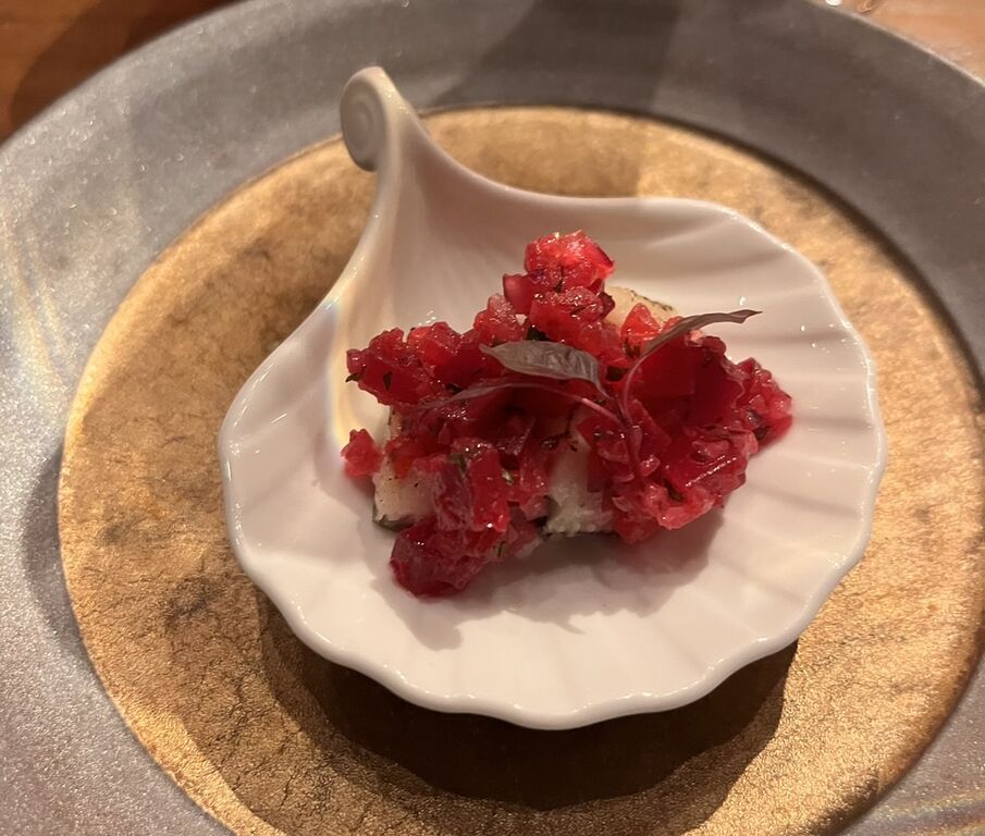 「鱧のマリネ赤野菜のソース」