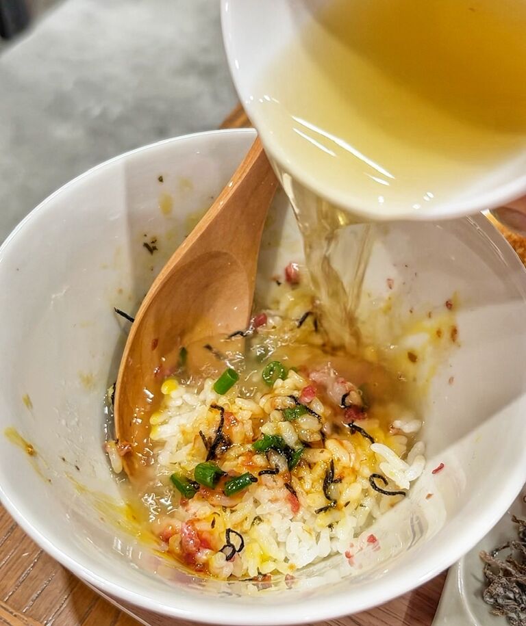 後半は、だし汁をかけてだし茶漬けを楽しみました。このだしは、天然昆布と老舗「浜弥鰹節」のサバ・カツオ節を使って店内でひかれた一番だし。牛トロ丼にかけて、無添加の塩昆布を合わせて、ひつまぶしのイメージでいただき、北海道の食材と関西のおだし文化とのマリアージュを楽しみました。