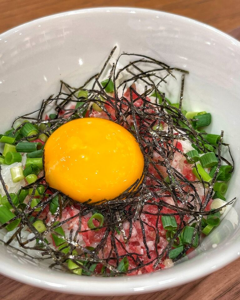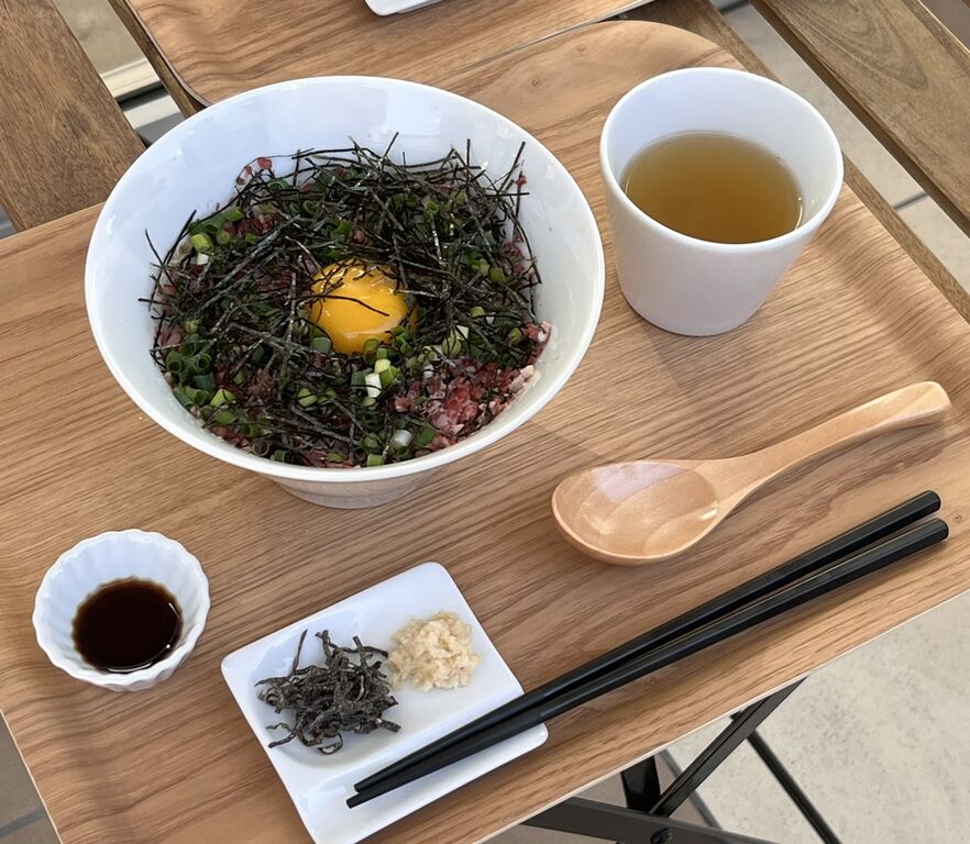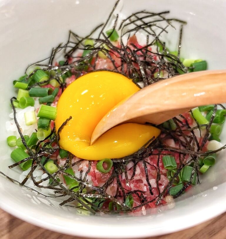 北海道・十勝地方において放牧で育った牛の肉を、生ハムのように作った牛とろフレークに薬味を合わせ、「北海道産米ななつぼし」のごはんにトッピング。そして濃厚で知られる「太田ファーム」の卵黄をオン。