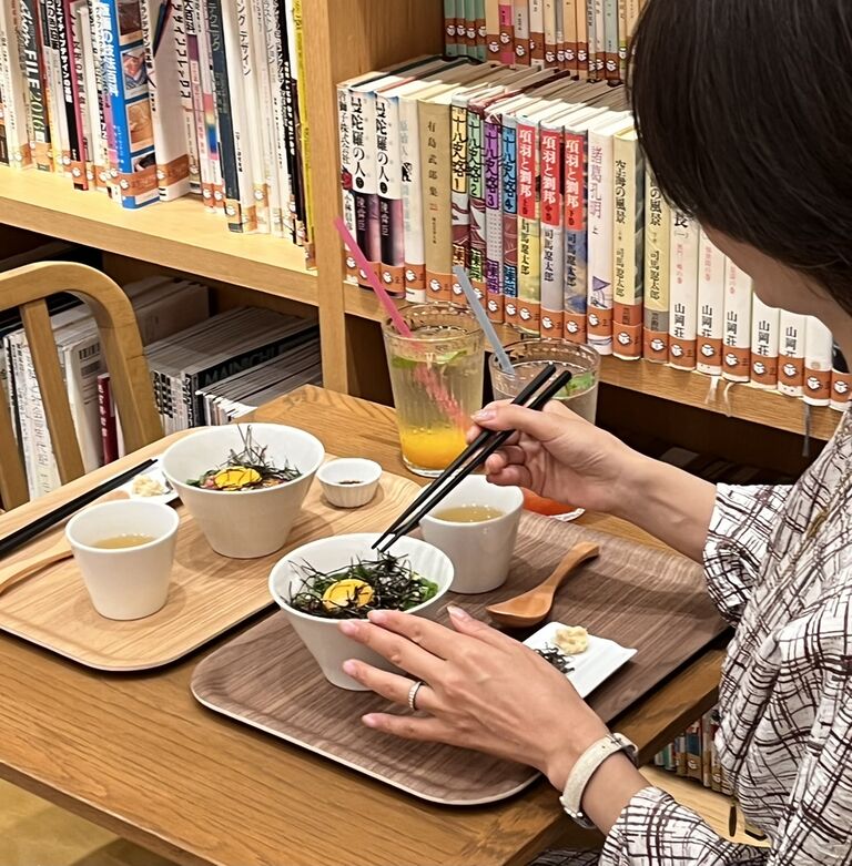 私設図書館の中にあり、本を読みながら手軽に食べられる北海道の食材を使った丼やコロッケ、ブレンドコーヒーや北海道産のクラフトビールなど、厳選された北海道のグルメが魅力。