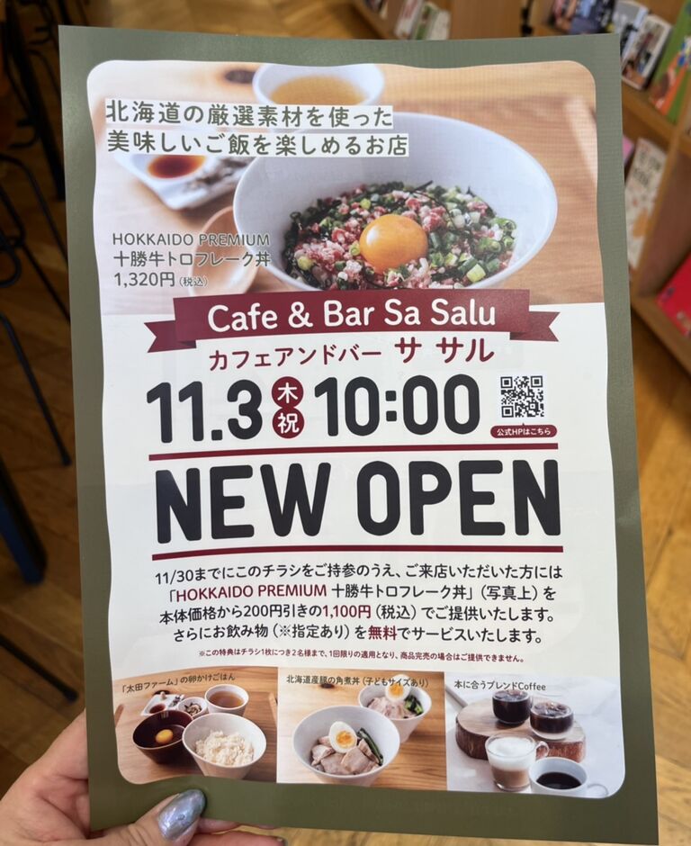 2022年11月3日(木・祝)、大阪・森ノ宮にある「もりのみやキューズモール BASE」にある私設図書館「まちライブラリー」内に、北海道の食材にこだわった飲食店「Cafe&Bar Sa Salu(サ サル)」がニューオープン!