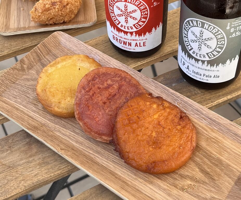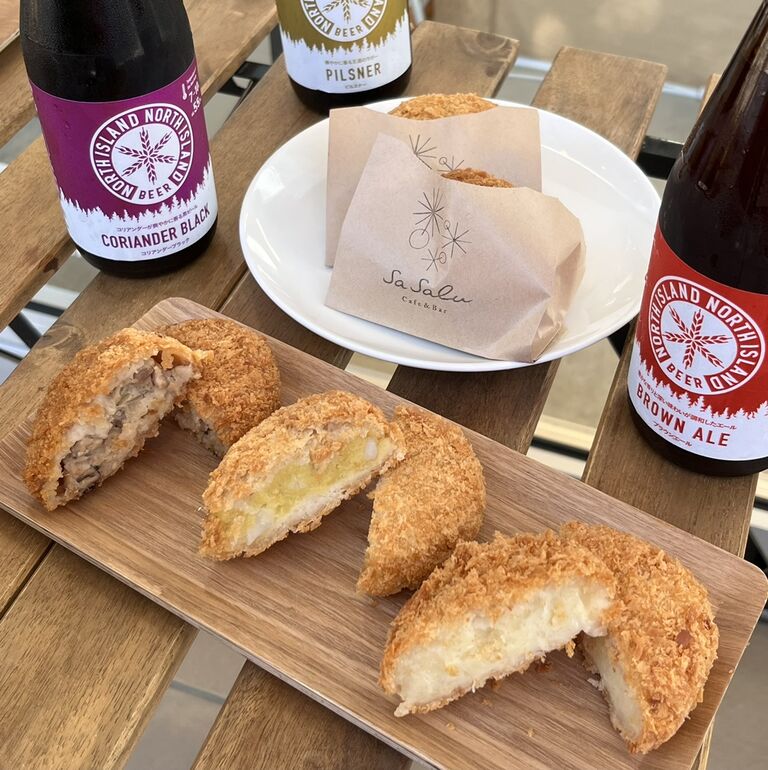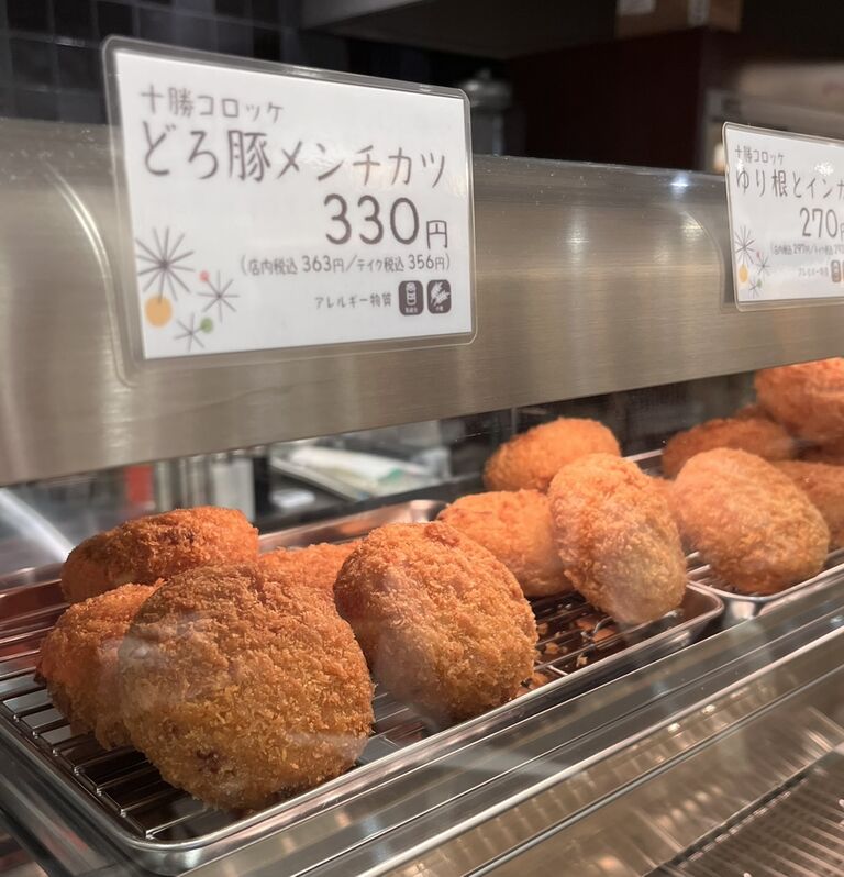 十勝といえば?揚げたてのほくほくコロッケ3種(どろ豚メンチカツ、ラクレットチーズ、ゆり根とインカのめざめ)といももち3種(インカのめざめ、ノーザンルビー、かぼちゃ)があり、ワンハンドのおやつやお酒のおつまみにおすすめです。