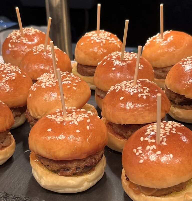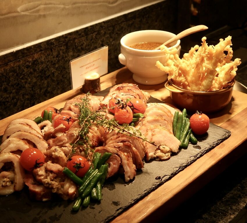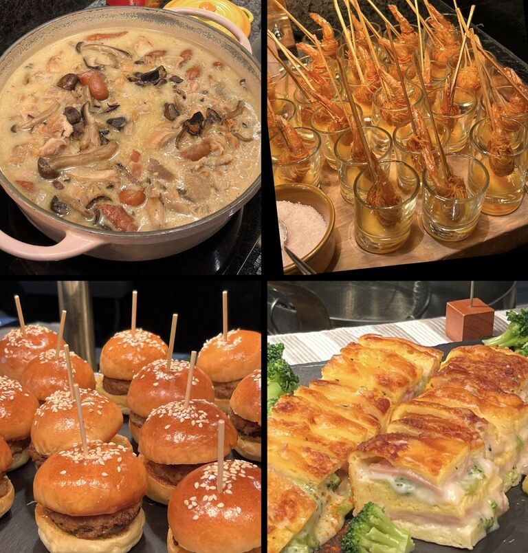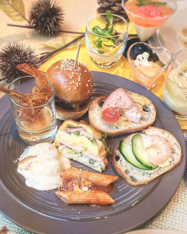 トリュフ香るポテトサラダ、秋野菜とマリネサーモンのチョップサラダ、チキンとキノコのフリカッセ、椎茸の肉詰め照焼きミニバーガー、鴨と茄子のラグーパスタ など。