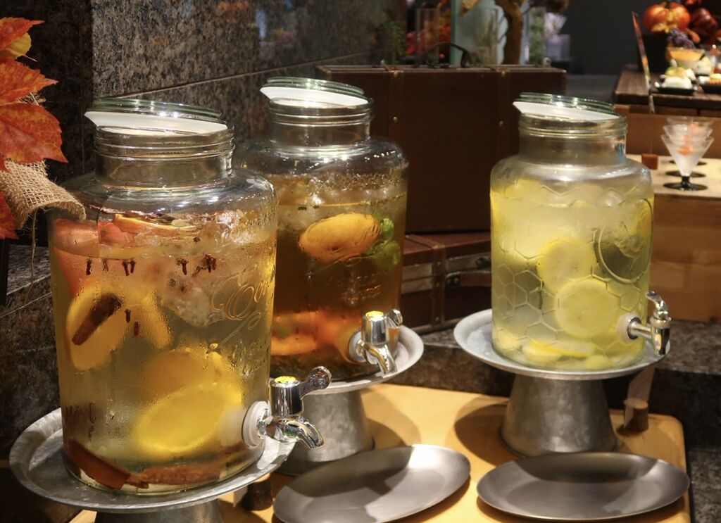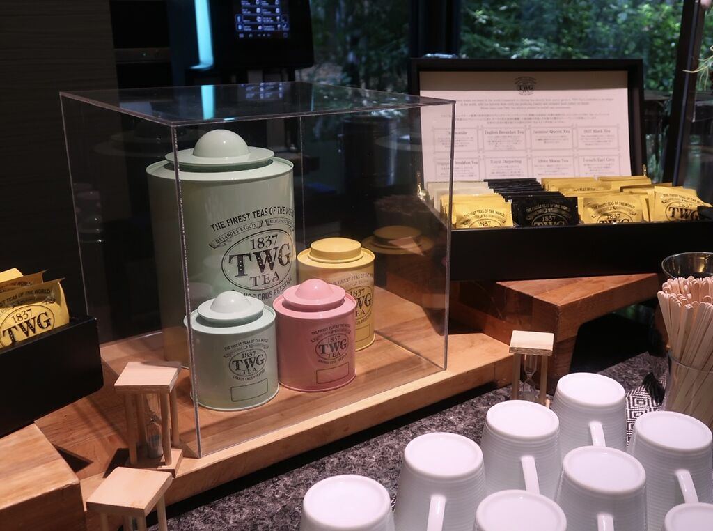 ドリンクは、レモネードやデトックスドリンク、TWG TEAのセレクション、コーヒーメニューまでそろっていて、好きなだけ飲めるのがうれしい。